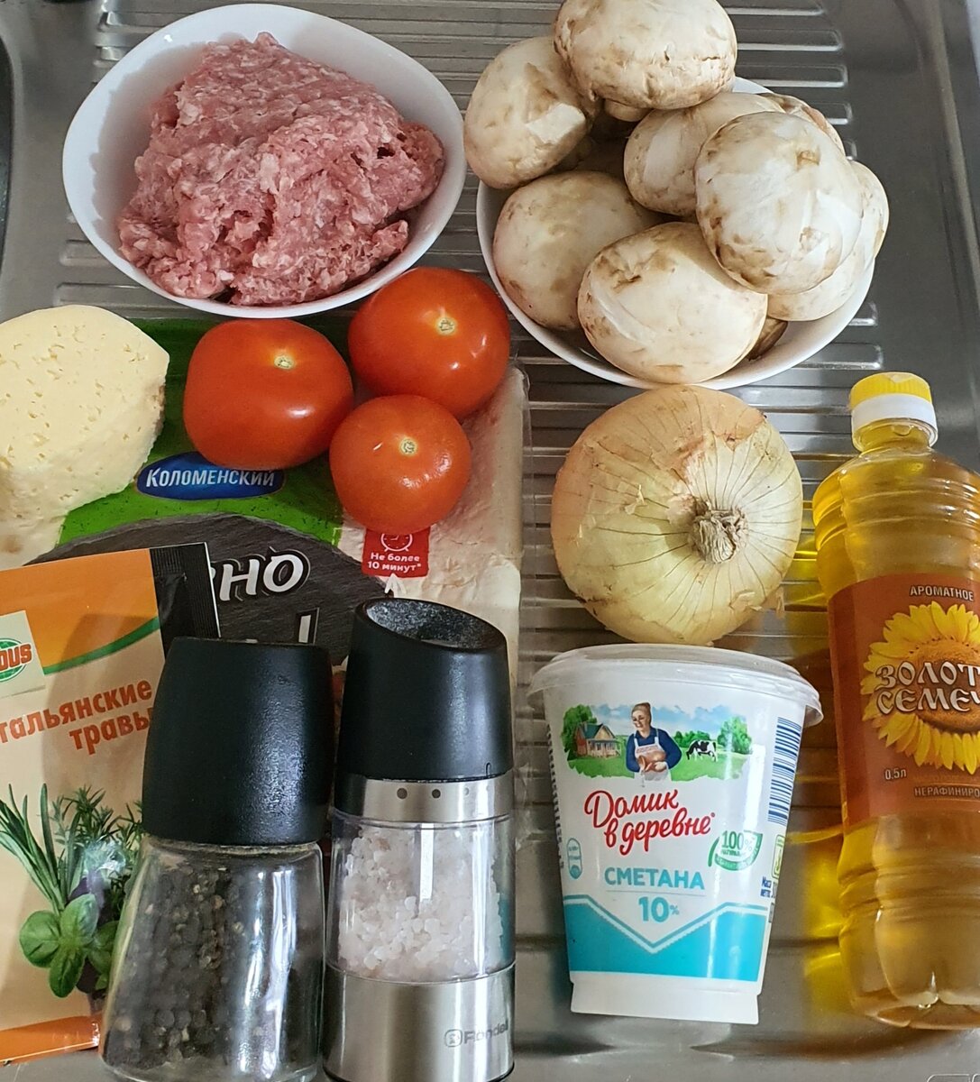 Блюдо по этому рецепту получается очень вкусное, не требует много времени и большого набора ингредиентов. Лазанья из тонкого лаваша отличается от классической версии, но получается не менее вкусной! Ингредиенты: - лаваш тонкий 2 -3 листа, около 200 грамм - фарш мясной (у меня свино-говяжий) 400 грамм - лук 1 большая луковица - помидоры 200 грамм - шампиньоны 150 грамм - сыр твёрдый 200 грамм - сметана 150 грамм - масло подсолнечное 50 миллилитров - травы итальянские сушёные 1 чайная ложка - соль и чёрный молотый перец по вкусу Лук очистить и нарезать мелким кубиком. Шампиньоны тщательно вымойте и нарежьте достаточно мелко. Помидор вымойте, вырежьте плодоножку. Нарежьте помидор полукольцами. Сыр натрите на мелкой тёрке. В сковороде разогрейте половину подсолнечного масла. Выложите в сковороду мясной фарш и лук. Обжарьте фарш с луком на сильном огне в течение 7-10 минут. Посолите и поперчите. Тщательно перемешивайте. Переложите обжаренный фарш в миску. В сковороду, где обжари