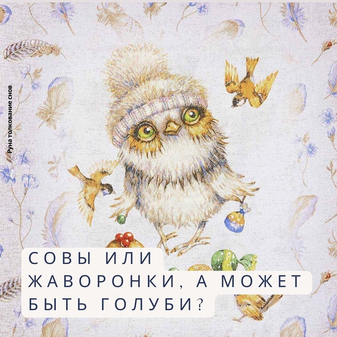 Как известно, существует два основных хронотипа (характер суточной активности) – «совы» и «жаворонки». Иногда выделяют третий – «голубей». Физиолог Алексей Ухтомский экспериментально доказал, что хронотипы существуют вне зависимости от чьих-то пожеланий и требований. «Жаворонки» рано ложатся спать и легко встают по утрам, активны в первой половине дня, но после обеда у них наступает спад. «Совы», просыпаются не ранее чем за пару часов до полудня, полноценно работать в первой половине дня не могут, пик их активности приходится на вечернее и ночное время, ложатся поздно. В зрелом возрасте считаются более здоровыми и психологически устойчивыми, чем «жаворонки». «Голуби» пробуждаются утром, но позже «жаворонков», постоянно активны в течение дня, без явных пиков и спадов, ложатся спать ближе к 23:00. Чаще склонны к психологическим проблемам и депрессиям, чем «жаворонки» и «совы». Принято считать, что среди городского населения промышленно развитых стран «сов» все-таки большинство – по разн