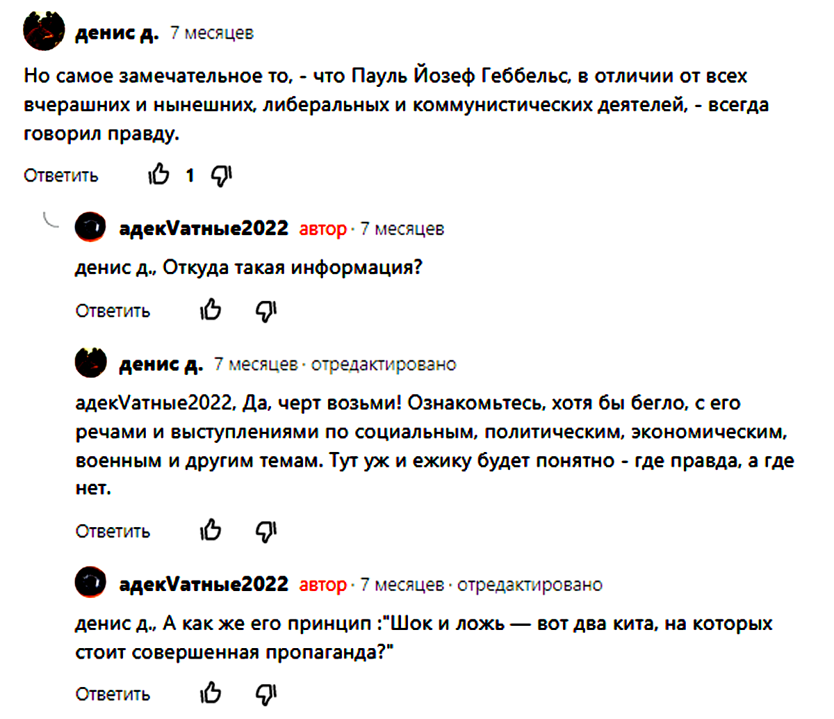 Так называлась моя статья на заблокированном канале. Я в ней знакомил сына с этой личностью. Но дело-то не в этом. Вопрос в том, что последовали крайне любопытные комментарии. Хотел вас с ними ознакомить. Вернее, с перепиской. Я общался с неким товарищем, который... Впрочем, сами увидите... Правдолюб всего лишь, больше - ничего! Я, конечно, осознаю, что аргументы все бесполезны, но все же зацепило... Согласен, я действительно серьезно и глубоко тему не изучал. Честно говоря, и не собирался... Пока, по крайней мере... А крыть-то нечем... Моя правда - та, которую я видел собственными глазами. А твоя? Что за истина у тебя? Чья? Какая? Надо же, как высокопарно! Мыслящий человек! Зерна от плевел! Но в принципе, все же жду ответа... К сожалению, само по себе звание доктора философских наук никак не характеризует ни моральных качеств человека, ни его психического состояния... Так что... И авторитетного мнения, боюсь, для моего оппонента не существует... --------------------------- Не знаю,