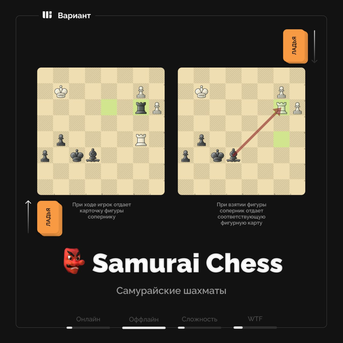 Мечи отдыхают. Благородные воины под тенью долгого дня могут развлечь себя самурайскими шахматами. К классическим доске и набору в этом варианте прибавляются карточки — у каждого из самураев по 7 штук: 1 король, 1 ферзь, 1 ладья, 1 конь, 1 слон и 2 пешки. Ход и карты Каждый раз, когда ты делаешь ход определенной фигурой, ты отдаешь соответствующую карту своему оппоненту. Нет такой карты — нет хода этой фигурой. Поэтому карточки надлежит тратить мудро: своими действиями ты можешь усилить или ослабить руку соперника. Скажем, ты сходил слоном. Ты отдаешь карту слона сопернику Взятие и карты Каждый раз, когда ты бьешь фигуру, твой оппонент отдает тебе карточку соответствующей взятой фигуры при условии, если у них такая карта есть и если у тебя есть такая фигура на доске. Ты взял коня. Если у тебя есть конь в игре и если у соперника есть карта коня, он отдает ее тебе. Если взяты все фигуры одного типа, то соперник отдает тебе все соответствующие фигурные к