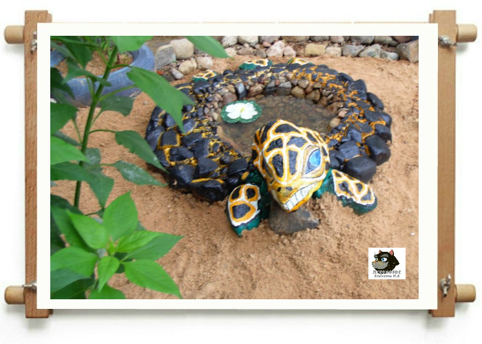 Нам остаётся выложить камнями наружную часть панциря. Смачиваем песок водой, выкладываем цемент, на него камни. Не забудьте добавить цементного раствора в область шеи и головы черепахи, как при лепке пластилином, соединяем детали.