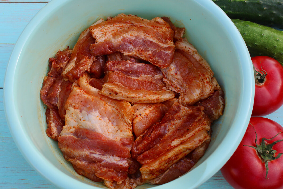 Вот только дорогая шея сейчас, не каждому по карману. У нас килограмм перевалил уже за 400 рублей. Но есть свиной шее неплохая альтернатива. И это - грудинка. Шашлык, правда, из неё чуть пожестче получается, но зато по цене она в два раза ниже, а по вкусовым качествам ничуть шее не уступает. Главное выбрать хороший кусок - с поросенка помоложе и с жировыми прослойками потоньше Приготовить грудинку на углях можно великим множеством способов, ниже один из вариантов. 1. С грудинки срезать ребра, кожу, пленки и нарезать поперек волокон ломтями толщиной 2 - 3 сантиметра. 2. К мясу добавить соевый соус, из расчета 2 ч. ложки на килограмм, такое же количество растительного масла, по вкусу черного свежемолотого перца, сухого чеснока, паприки и соли. Хорошо перемешать, чтобы приправы равномерно распределились и убрать в холодильник часа на 4. 3. Обжар