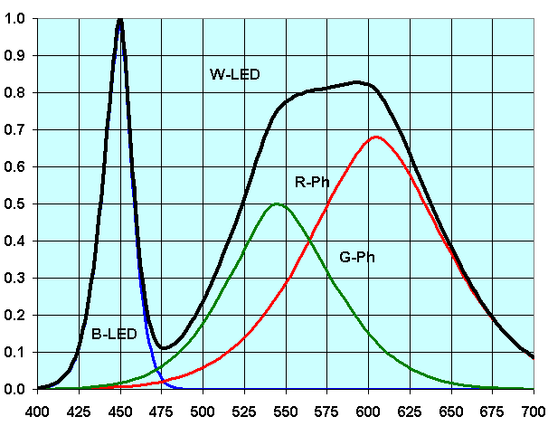 Как делают белый светодиод? Берут синий кристалл и покрывают его тем или иным способом люминофором (желтым, или смесью зеленого и красного). При этом неизбежны потери, поэтому оптическая мощность белого светодиода будет существенно меньше мощности синего светодиода. Но яркость будет выше. Почему? Если длина волны люминесценции больше длины волны возбуждающего излучения, то такие люминофоры называются стоксовыми, в честь Дж. Г. Стокса (1819–1903), английского математика, механика и физика. Существуют и антистоксовы, излучающие на более короткой длине волны, чем длина волны возбуждающих свечение фотонов. Рассмотрим энергетические спектры мощного светодиода X-LAMP Cree. Выберем средний спектр (желто-зеленая кривая) и смоделируем его. Энергетический спектр белого светодиода будет выглядеть следующим образом. Отметим, что левая часть спектра белого светодиода не соответствует форме гауссовой кривой. Это потому, что в покрытии синего кристалла с длиной волны около 450 нм (royal blue) испол
