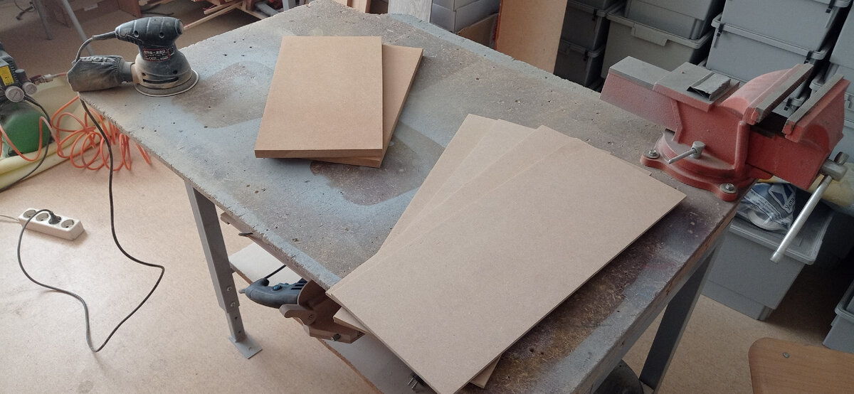 Немного отдохнув от шкафов, изготавливая всякие мелкие, но нужные доделки, я вновь вернулся к крупной мебели. По задуманному в голове проекту под боковым верстаком планировались две выкатных тумбочки. Их я делал по уже отработанной технологии: клееный каркас из МДФ разной толщины (наибольшая толщина для нагруженных мест) Плюс деревянные элементы для фасадов. В дело пошли запасы сосновой некондиционной вагонки, которую я напилил на более-менее ровные прямоугольники и склеил в щиты. Потом подогнал по толщине и отшлифовал Я склеил их довольно качественно, но все равно решил усилить поперечной планкой из МДФ, а для этого выбрал паз в каждом щите. После этого фасады успешно пристыковались к заранее сделанным выдвижным ящикам. Крышки тумб я сделал в виде небольших столешниц, поверхность которых тоже можно использовать, как рабочий стол. Поэтому их кромки выступают за пределы корпусов, чтобы можно было при необходимости зацепиться струбциной. Далее - окраска в уже известную гамму черного и же