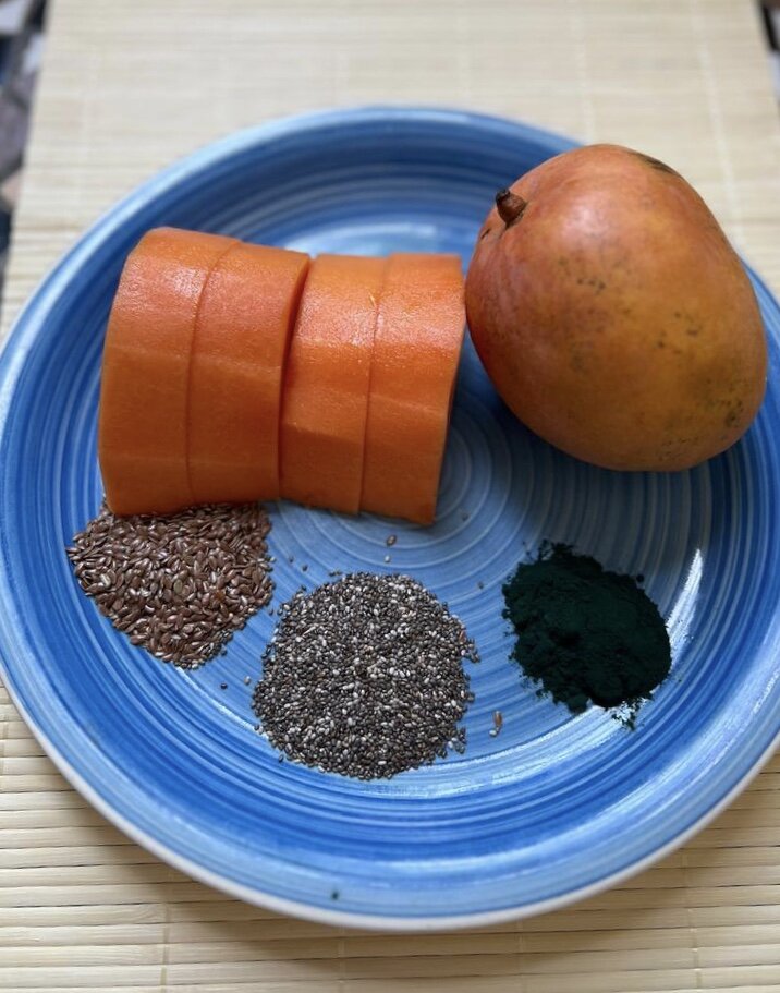 Какие напитки обычно сопровождают ваш завтрак? Думаю чаще всего ответ будет кофе или чай. Я же не представляю свой завтрак без фруктового смузи, впрочем чай тоже присутсвует ,а иногда крайне редко и кофе. С кофе у меня сложились довольно непростые взаимоотношения, когда-то я выпила его слишком много, и с тех пор мне стало казаться , что вкус кофе сильно отдает химией и ароматизаторами😆 Продукты , которые я чаще всего использую для смузи: Папайя. В Мексике она является доступным ,относительно дешевым фруктом, цена за килограмм- 25 песо( 120 руб) Манго. Фрукт, которого у меня даже слишком много, каждый день с дерева осыпается до 30 штук, и их надо как-то перерабатывать. И теперь манго присутствует везде - напитки , компоты, смузи, конфеты, чипсы. Вплоть до того , что даже начинается аллергия от его переедания 😆. Я никогда его и не любила , ела только зелёное в салате. А теперь пришлось приспособиться. Думаю огородники , которые собирают большой урожай ,меня поймут. Чиа. Популя