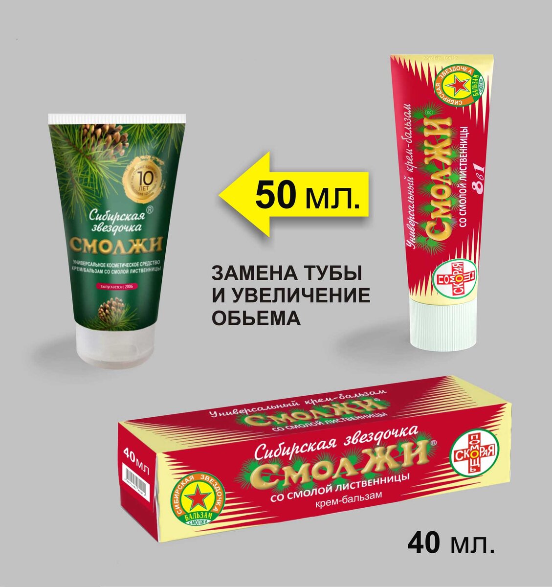 Универсальный крем/бальзам "СМОЛЖИ - Сибирская звездочка" в продаже с 2006 года. Основным уникальным ингредиентом является смола Сибирской лиственницы. Также в состав крема входят: экстракт шиповника, экстракт облепихи, экстракт календулы, натуральные масла: эвкалипта, ели, кокоса, пальмового и чайного дерева... Глубоко проникая в клетки кожи, крем стимулирует и ускоряет процессы регенерации кожного покрова, эффективно восстанавливает структуру клеток кожи. Благодаря богатому составу - ему любые проблемы связанные с кожей по плечу! СКОРАЯ ПОМОЩЬ: Ускоряет заживление различных ран, порезов, ссадин, синяков, обморожений, ожогов (солнечных и термических), укусы насекомых (снимает зуд и раздражение уже через 1-2 минуты). МЕЧТА ДАЧНИКА: Делает кожу рук нежной и бархатистой от контакта с землей, удерживает влагу, размягчает коду, заживляет трещину и порезы. МЕЧТА МАССАЖИСТА: Прекрасный крем для массажа тела, вначале немного жирноватый, что дает делает глубокий и качественный массаж, а пот