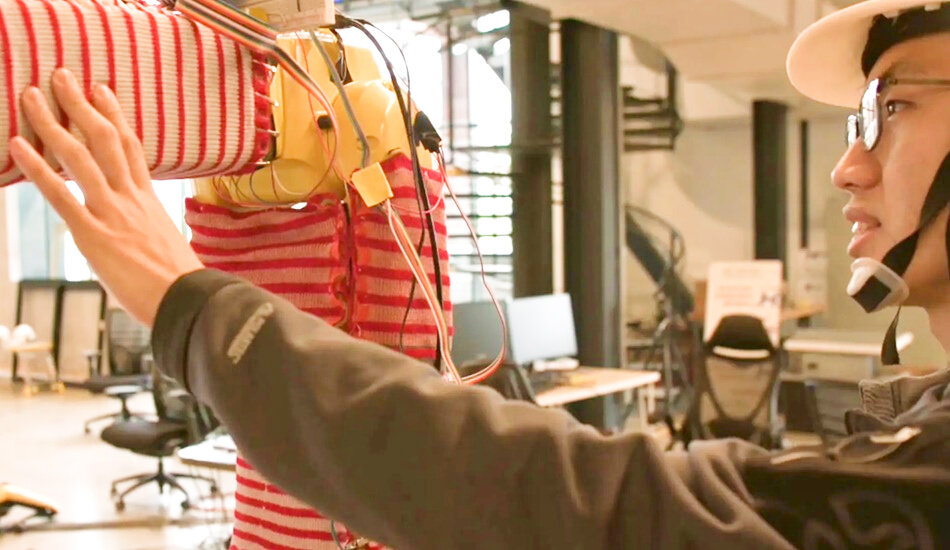 В последние годы промышленные роботы оснащаются датчиками, которые обнаруживают физический контакт с людьми или другими объектами. В последние годы промышленные роботы оснащаются датчиками, которые обнаруживают физический контакт с людьми или другими объектами. Однако ими оборудованы далеко не все автоматы. Ученые из Университета Карнеги-Меллон разработали технологию RobotSweater, чтобы подарить им чувство осязания и сделать пространство вокруг роботов более безопасным. Технология довольно проста. «Одежда» для робота состоит из трех слоев материала и надевается на его движущиеся части. Далее ее подключают к источнику питания. Верхний и нижний слои состоят из обычной нейлоновой пряжи с проходящими через них полосками проводящей нити из металлических волокон. Между этими двумя слоями находится изолирующая непроводящая сетка. Пока на RobotSweater не оказывается внешнего давления, два слоя отделены друг от друга. Однако, если робот встречается с препятствием, слои соединяются через отверст