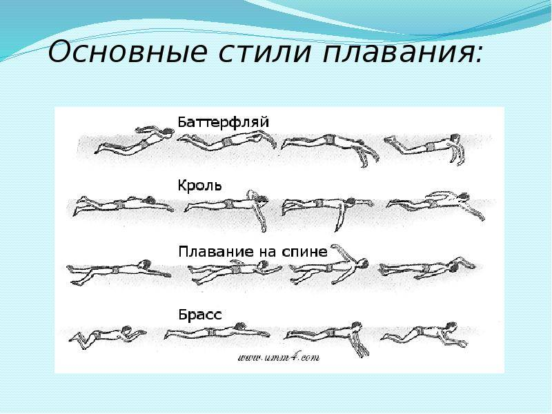 - Начните с освоения навыков безопасности. Узнайте, как правильно и быстро выполнять основные плавательные стили: кроль, на спине, брасс и дельфин.