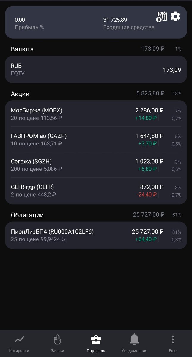 Всех рад приветствовать! Очередной выпуск и вот уже можно проследить небольшой прогресс. С каждым выпуском эксперимент рискует быть удачным и кто знает, возможно уже через 10 лет, можно будет использовать его, как доказательство, что портфель может иметь каждый) Давайте посмотрим, что стало нового в нашем протфеле: Самые внимательные из вас заметят отсутствие 3 бумаг ЛСР и правильно, я их продал в плюс 18%, а на эти декньги купил Мосбиржу. Так же мы добавили 200 бумаг Сегежы и 10 бумаг Газпрома. Логика простая, газа и дерева в России полно, а значит бизнес будет жить. По правилам эксперимента нет запретов и стратегий, просто желание владеть портфелем. Есть правда одна установка, которую по возможности нужно соблюдать, портфель должен быть прибыльным. По моим грубым подсчётам от облигаций прило 700 рублей и ЛСР мы продали в плюс 400, как миним на 1000 мы в плюсе, а это уже маленькая победа. Сила маленьких шагов в действии. Традиционно посмотрим будущие выплаты и там без изменений, но дл