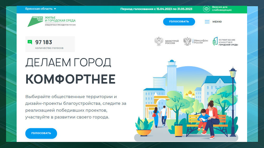 В Брянске и еще четырех городах региона до 31 мая продолжается голосование за благоустройство в 2024 году общественных территорий, которые предложили сами их жители. На сегодняшний день свой выбор сделали более 97 тысяч человек.