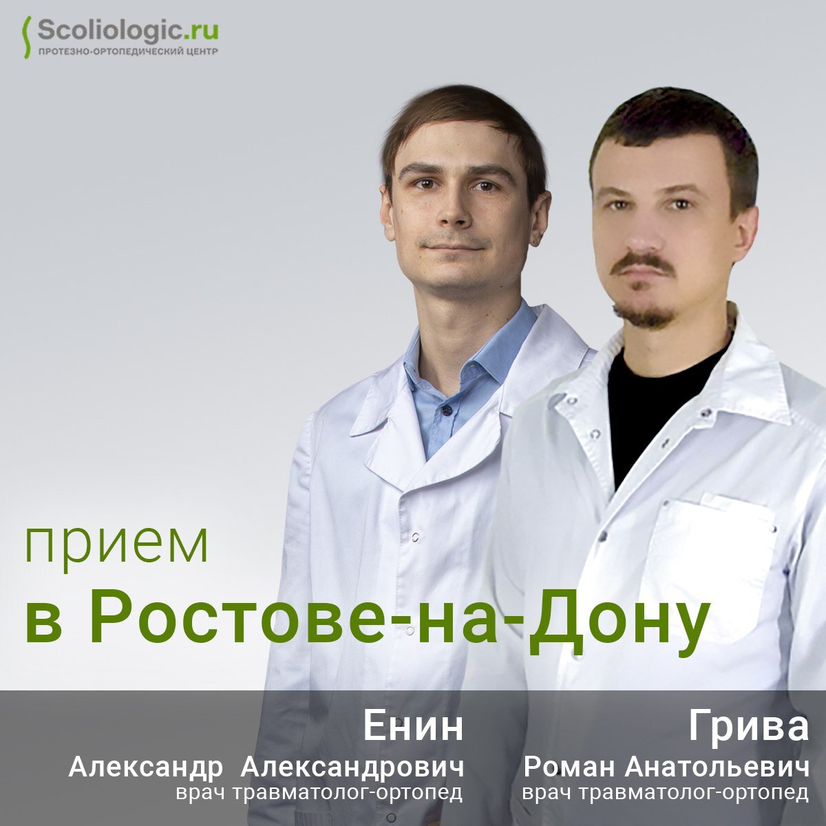 Прием пациентов в Ростове-на-Дону будет вести врач травматолог-ортопед Роман Анатольевич Грива. А врач травматолог-ортопед Александр Александрович Енин будет приезжать из Санкт-Петербурга примерно один раз в три месяца на выдачу корсетов и коррекцию.