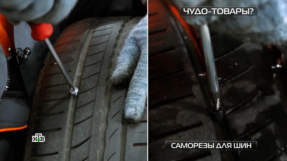 [ Смотреть видео на сайте НТВ ] Производители саморезов для шин обещают, что они помогут избежать неприятностей после прокола колеса и безопасно доехать до мастерской. Сделаны саморезы для шин из металла, покрыты полимером и продаются в двух размерах: крупные — для автомобилей и проколов до 5 миллиметров, мелкие — для транспорта и дырок поменьше. Цена — от 200 с небольшим рублей за комплект. После 20 км пробега на мотоцикле с саморезом в колесе давление не изменилось. А более тяжелая машина прошла 40 км, и саморез остался на месте, отверстие визуально не изменилось. Проверка в Центре испытаний НАМИ дала невероятные результаты. Оказалось, что саморез выдерживает давление, которое в 4,5 раза превышает необходимое для нормальной эксплуатации колеса и автомобиля. Это, наверное, лучшая гарантия надежности этой технологии. Конечно, саморез может разболтаться со временем, особенно на реальной дороге с ее разнообразными нагрузками для резины, поэтому лучше все-таки не ездить с ним долго, а сра