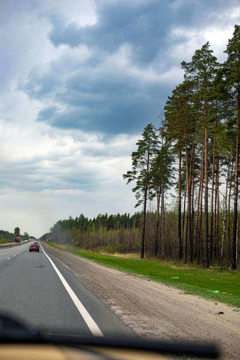 Как только выехали - начала портится погода, похолодало, набежали тучи. Незадолго до того, как нам нужно было сворачивать с трассы М-7, пошёл дождь. Мир приобрёл мокрые полутона.