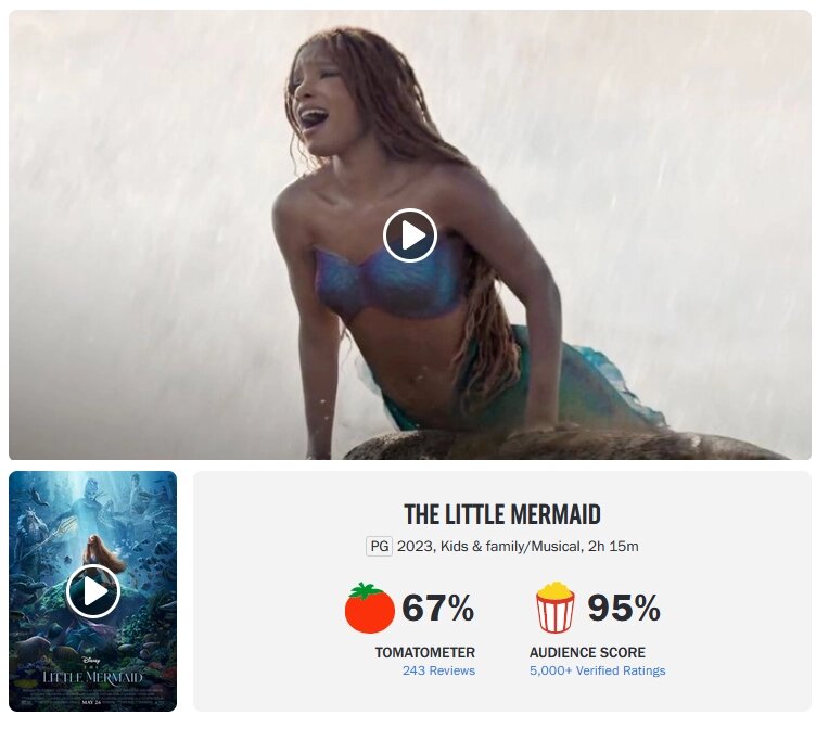 Удивительное рядом. Пока зрительский рейтинг киноадаптации “Русалочки” на сайте Rotten Tomatoes бьет все рекорды с 95% свежести, этот же фильм, но на другом популярном агрегаторе, Metacritic, пробивает дно.