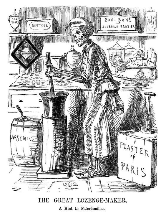 В Викторианскую эпоху сахар облагался налогом и посему был дорогим удовольствием — его даже называли «белым золотом». Чтобы снизить расходы и стоимость готовой продукции, попутно не погубив здоровье покупателей, кондитеры частенько смешивали сахарный песок с известью и гипсом.