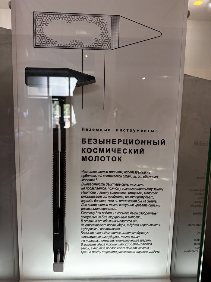 Вчера наконец побывал в Самарском музее космонавтики. Кто не в курсе, Самара - Мекка космических технологий России. Фото как раз из музея. Когда говоришь о космических технологиях, в голову сразу приходят ракеты, скафандры, спутники, возможно Илон, Теслу его побери, Маск. Но космос, он особенный во всём. Отсутствие гравитации делает все привычное на земле чуточку другим, чуточку сложней и интересней. К примеру обычная шариковая ручка на орбите просто не будет работать. Не миновала эта участь и молоток, оказывается, просто так обычный инструмент работать не станет - отскочит, вот и пришлось инженерам его подкрутить. Для тех, кому лень читать описание на картинке, привожу его здесь: Чем отличается молоток, используемый на орбитальной космической станции, от обычного молотка? В невесомости действие силы тяжести не проявляется, поэтому согласно третьему закону Ньютона и закону сохранения импульса, молоток отскакивает от предмета, по которому бьёт, гораздо дальше, чем он отскакивал бы на Земле. Для космонавтов такая ситуация чревата самыми различными травмами. Поэтому для работы в космосе были изобретены специальные безынерционные молотки. В отличие от обычных молотков они не отскакивают после удара, а будто «прилипают» к ударяемой поверхности. Безынерционный молоток имеет следующую конструкцию: его ударная часть полая, а в полость помещены металлические шарики. В момент удара нижние шарики устремляются вверх, а верхние продолжают двигаться вниз. Трение между шариками рассеивает энергию отдачи.