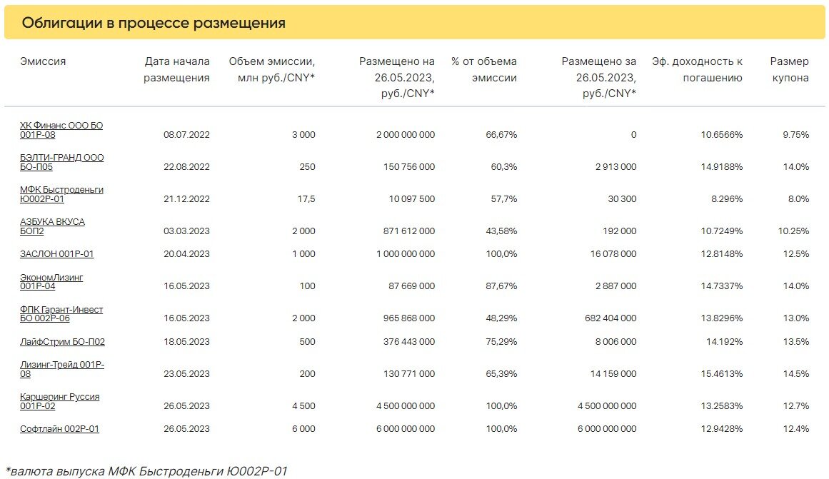 Коротко о торгах на первичном рынке 26 мая стартовало и завершилось одним днем торгов размещение двух выпусков: Каршеринг Руссия 001P-02 (4,5 млрд рублей за 19 105 сделок) и Софтлайн 002Р-01 (6 млрд рублей за 10 987 сделок). Также завершилось размещение ЗАСЛОН 001Р-01. Выпуск размещался с 20 апреля. Объем эмиссии — 1 млрд рублей, 26 мая были размещены последние 16 млн 78 тыс. рублей. Завершилось и доразмещение облигаций серии БО-002Р-02 эмитента АПРИ «Флай Плэнинг» в объеме 75 млн рублей по цене 100,5%. Общий объем эмиссии — 825 млн рублей. Коротко о торгах на вторичном рынке Суммарный объем торгов в основном режиме по 281 выпуску составил 879,1 млн рублей, средневзвешенная доходность — 12,19%. 📊 Подробнее в ВДОграфе Больше актуальных новостей читайте оперативно в нашем телеграм-канале