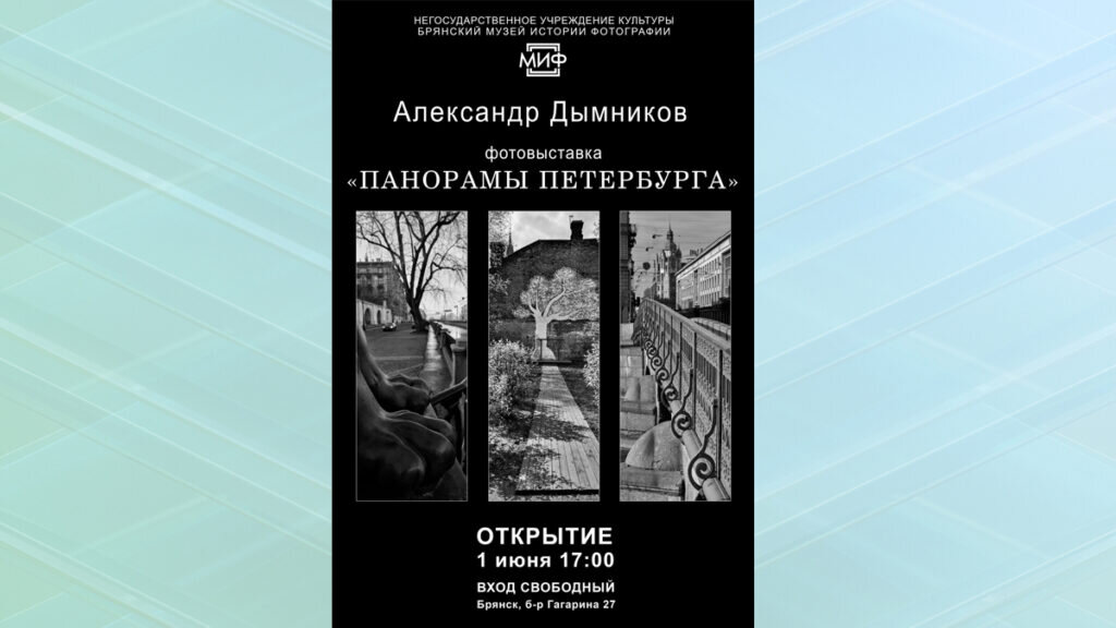 В Брянком музее истории фотографии откроется фотовыставка Александра Дымникова «Панорамы Петербурга». Мероприятие состоится в четверг, 1 июня. Начало в 17 часов. Александр Александрович Дымников — председатель Союза фотохудожников Санкт-Петербурга, член Правления Союза фотохудожников России. Фотограф, куратор, путешественник. Автор более 40 персональных выставок. Автор 2-х фотоальбомов. Член жюри ряда международных фотоконкурсов. Основатель и куратор издательского проекта «Авторская фотография Петербурга». Фотографии Александра Дымникова хранятся в Государственном Русском музее, в Государственном музейно-выставочном центре Росфото, в Музее Истории Фотографии, в Государственном музее «Царскосельская коллекция», в галерее «Рахманинов дворик». В экспозиции будут представлены 36 работ. Вертикальные и горизонтальные панорамные снимки Петербурга. 0+ ФОТО: МИФ В Брянком музее истории фотографии откроется фотовыставка «Панорамы Петербурга»