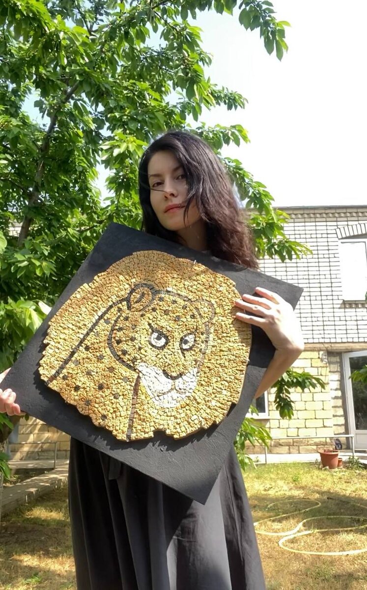 Я с детства любила мозаику. Её было немного в Дагестане, но я всегда радовалась, когда я проезжала мимо автобусных остановок, любила ее разглядывать. И у меня всегда было желание попробовать что-то мозаичное. Когда я в какой-то период жизни жила в Москве, то нашла там классную школу мозаики и прошла обучение. И я сейчас занимаюсь мозаикой больше, чем графикой. Мне приятен сам процесс, начиная с наколки камня — в этом я нахожу удовольствие, выход энергии. Еще нравится сложность мозаики, необходимо постоянно переключаться: ты накалываешь камень, готовишь основу, набираешь камень, снова накалываешь и т.д. Весь камень я накалываю сама. Это сложно, но мне нравится, и я и дальше хотела бы заниматься мозаикой.