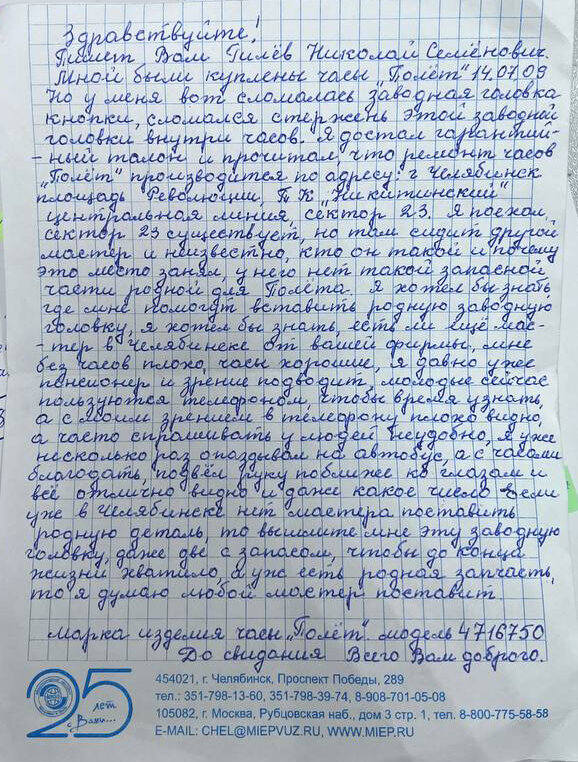Несколько месяцев назад к нам пришло письмо, на старый адрес. Благодаря добрым людям оно все-таки попало к нам. Написал его, Николай Семенович из Челябинской области, с просьбой помочь отремонтировать его любимые часы, которые он приобрел 14 лет назад.