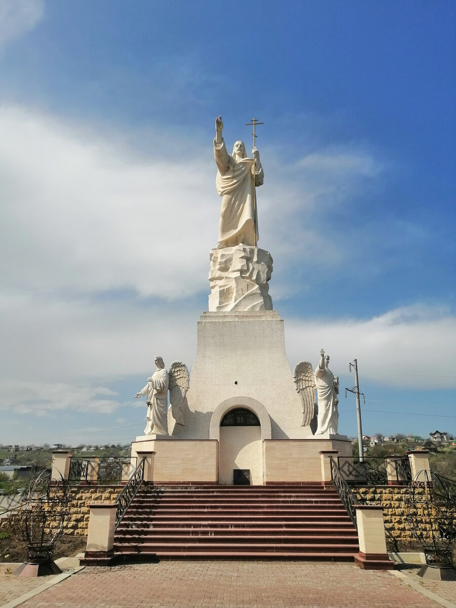 Скульптурный образ Христа возведён на возвышенности, по типу Масличной горы в Иерусалиме. Перед скульптурным образом Христа Воскресшего, стоят апостолы Петр и Павел.