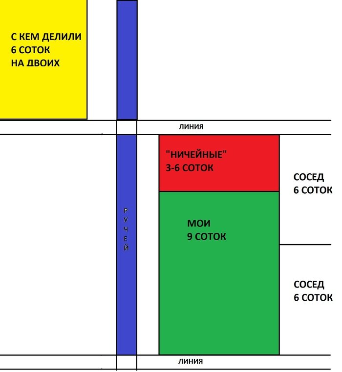 Добрый день. Помогите советом как бы мне законно приобрести "ничейный" участок в СНТ. Суть в следующем: в начале 90-х, от завода были розданы участки сотрудникам, по 6 соток на человека. Одна мадам отказалась (как выяснилось потом, только на словах) от своего участка и ее 6 соток на двоих разделили другие желающие. Этим двум новым владельцам были сделаны документы на 9 соток каждой. Один из которых я и купил (см. картинку ниже, зеленого цвета). Я сделал межевание, вынес границы, короче всё по красоте. Вторым владельцем второй половины "отказного" участка была соседка, которая находилась через линию (дорогу) от своей добавки (см. картинку ниже, желтого цвета). Когда она делала межевание, кадастровый инженер сказал, что они не могут сделать один участок из двух, которые находятся через линию, и ее 9 соток вместили на той стороне линии. И получается, что оставшиеся условные 3 сотки зависли. Есть и другая проблема. Когда раздавали участки, женщина, которая отказалась, не оформила отказ док