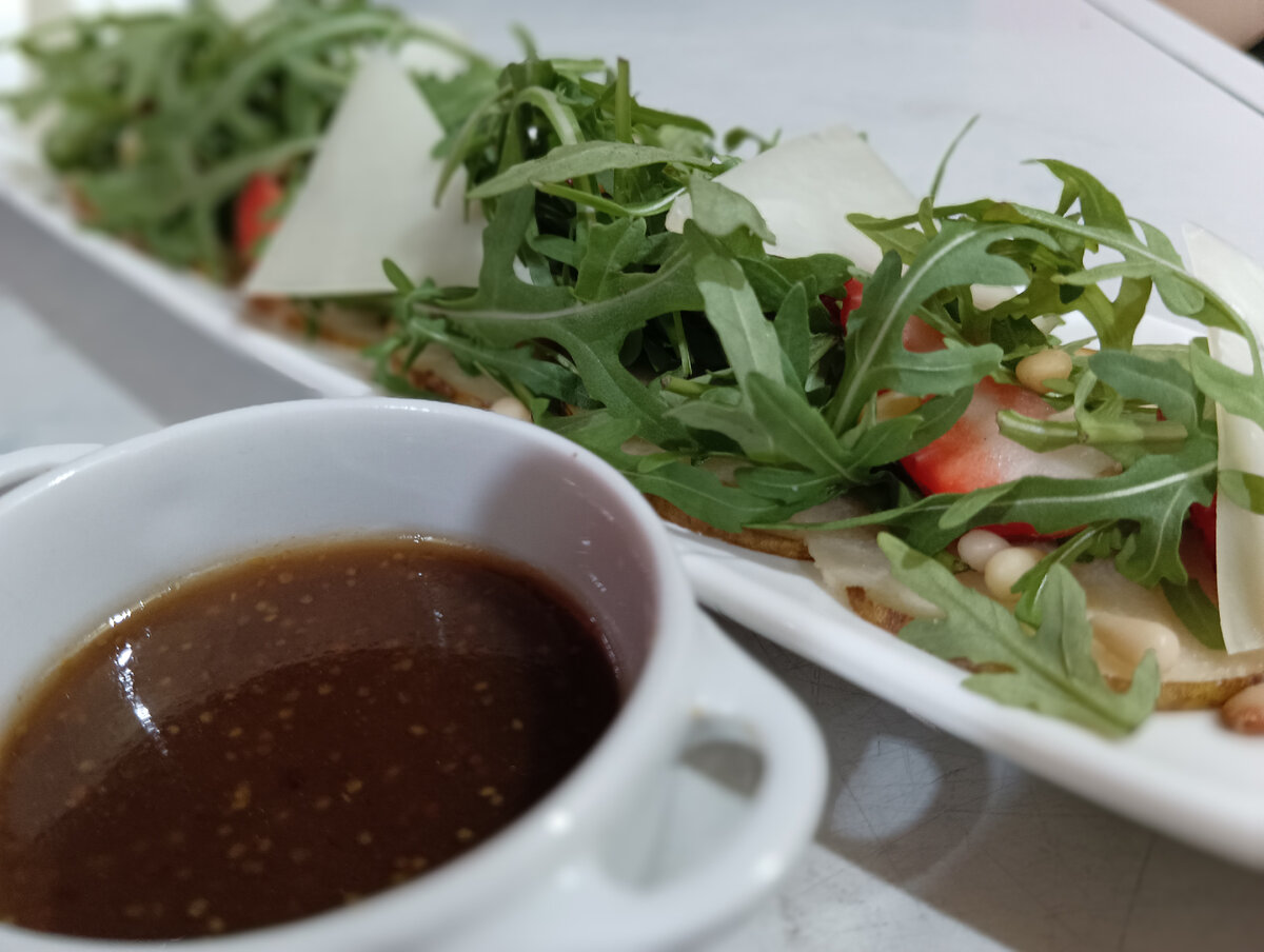 Доброго времени суток, уважаемые гурманы и просто любители вкусно поесть. Канал "Готовят в ресторанах", созданный для любителей нового, вкусного, правильного и, иногда, неожиданного в еде, приветствует Вас!!! Сегодня расскажу об интересном салате с рукколой. Подаётся этот салат в маленьком ресторанчике Подмосковья, но я о нем узнал у одного из своих первых мастеров - итальянца Джузеппе Стоянно. Благодаря неожиданному сочетанию ярких продуктов, этот салат взрывает вкусом и оставляет положительные эмоции надолго, ингредиенты радуют низкой калорийностью, а вариаций этого салата может быть несколько, как с креветками , так и без них, тоже можно сказать и о кедровом орехе и даже если вы на свой вкус замените пармезан на более легкий творожный сыр это не испортит эмоционального эффекта. Заправка: -масло оливковое-20г -горчица зерновая-10г -мед цветочный-10г -сок лимона-3г -соль-1г (Просто смешиваем венчиком до однородности) Ингредиенты: -руккола-40г -клубника свежая-40г -груша свежая (конфер