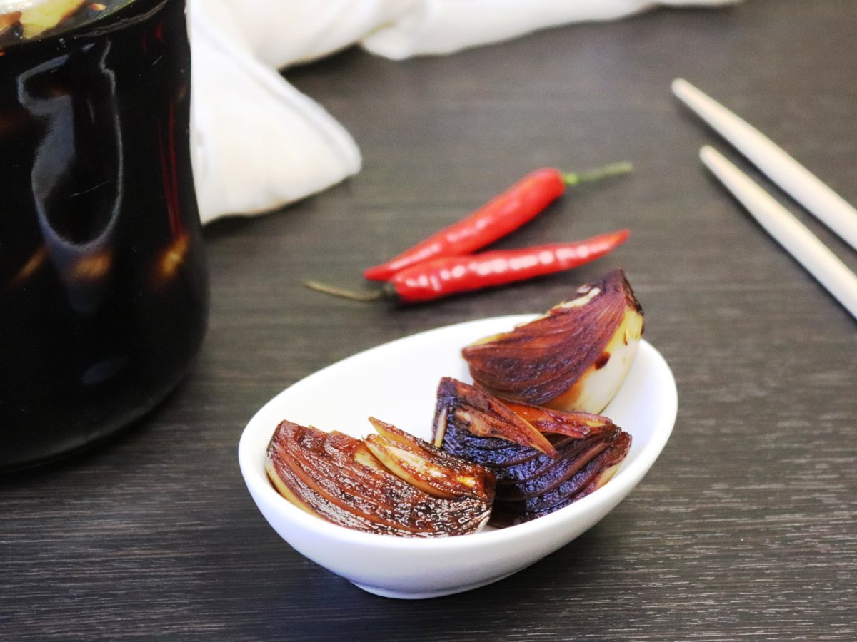 Острый перец по вкусу, можно положить побольше, если любите острое. 2. Лук я нарезала на четвертинки, я специально выбрала маленькие головки. Чили нарезать колечками. 3. Приготовить маринад, смешав соевый соус, сахар и воду. Довести до кипения и влить яблочный уксус. Проварить минут 5-7, чтобы сахар растворился и маринад слегка загустел. В конце выдавить в маринад сок лимона.