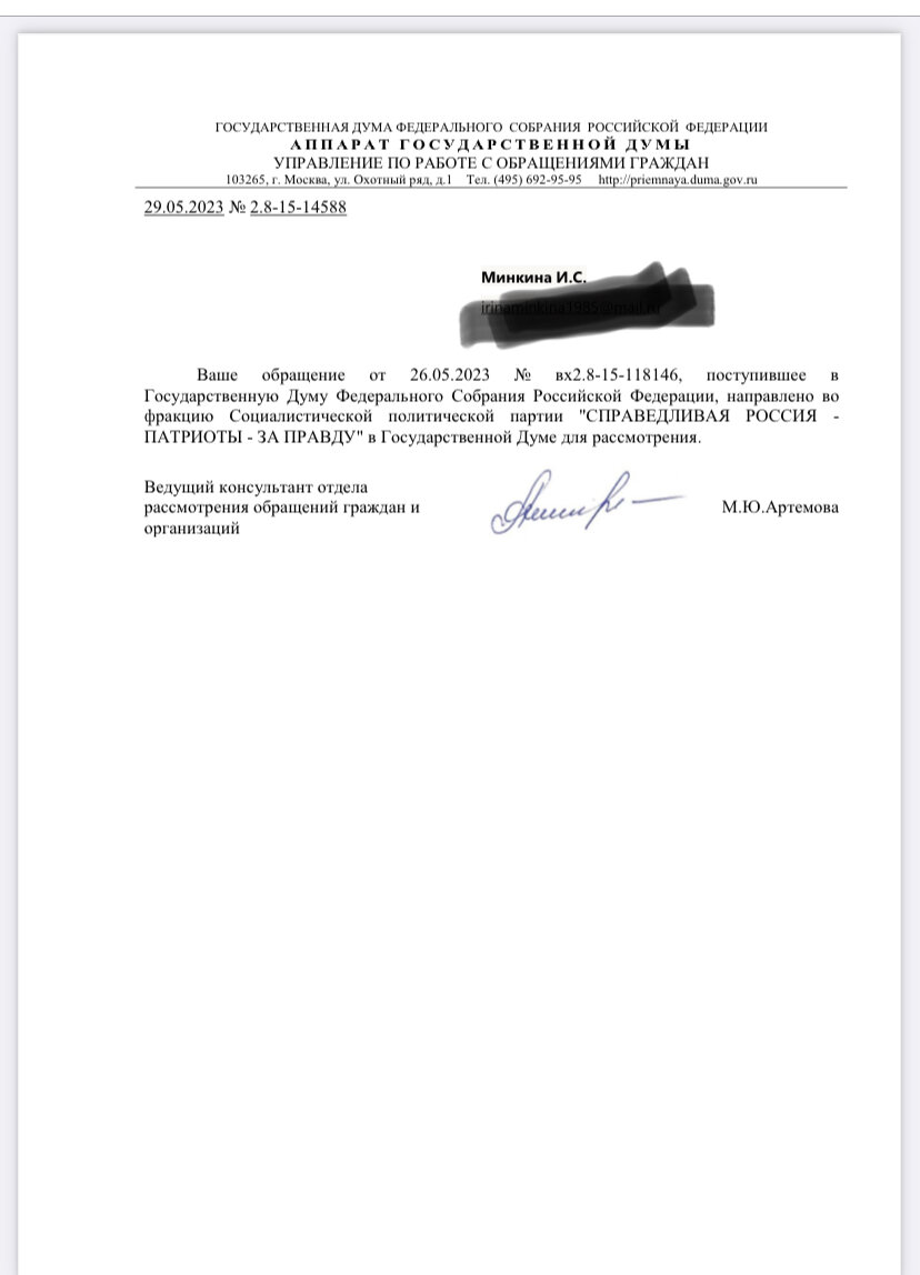 Сегодня мне пришел официальный ответ из ГД РФ, где сказано, что моё обращение передали в партию справороссов. Прикрепляю ответ из Госдумы к этому тексту.
