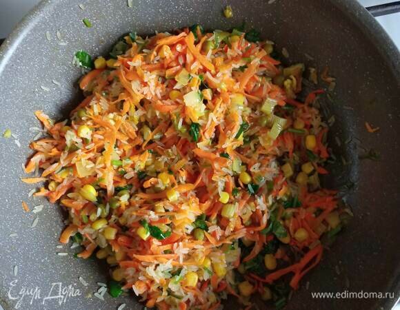 растительное масло для жарки - 2ст. л. Шаг: 1 Лук очистить и мелко нарезать. Морковь очистить и натереть на терке. Сельдерей мелко нарезать. В сковороде разогреть растительное масло. Обжарить лук 1 минуту, добавить морковь и сельдерей. Обжаривать 3–4 минуты. Добавить в сковороду промытый рис, кукурузу, горошек и мелко порубленную кинзу, перемешать, чтобы рис пропитался маслом. Шаг: 2 Переложить смесь в форму. Залить двумя стаканами кипятка или горячим буль