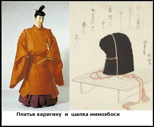 Когда Ёсихид'э приглашали в дом господина, то он приходил во дворец в платье каригину тёмно-жёлтого цвета и головном уборе момиэбоси, в одеянии, которое обычно носили придворные.