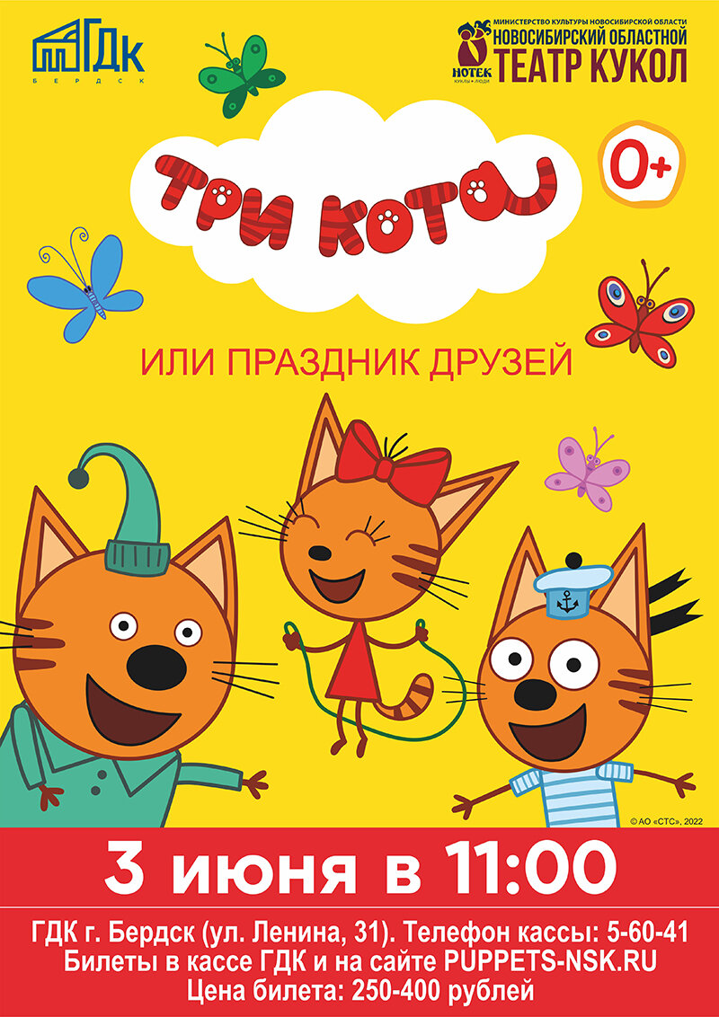 В субботу, 3 июня, в 11:00 в большом зале ГДК Бердска состоится детский спектакль «Три кота или праздник друзей». Эта история из жизни друзей – трех любознательных котят – Компота, его братика Коржика и их сестренки Карамельки. В большой и дружной семье жизнь никогда не стоит на месте, она насыщена событиями! История о том, как самая обычная прогулка по лесу может стать настоящим приключением, подарить новые встречи и новых друзей. В спектакле котята вместе с маленькими зрителями подружатся с Ежиком, Сорокой и тетей Пчелой! Постановочная группа: Режиссёр: заслуженная артистка РФ Ольга Гущина Художник: Анна Гуляева Композитор: Владимир Натанзон Продолжительность: 35 мин Детский спектакль «Три кота или праздник друзей» «Новосибирский областной театр кукол», г. Новосибирск (0+). Билеты можно приобрести в кассах ГДК (ул. Ленина, 31). Цена билета – 250-400 руб. Тел. 560-41 (касса ГДК), 300-48. Сайт: http://гдкбердск.рф Соц.сети https://vk.com/gdkberdsk 0+ Реклама Источник: сайт Бердск-Онлай