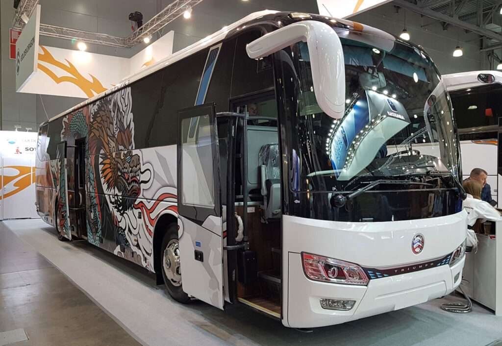 Китайская компания Xiamen Golden Dragon Bus выпускает автобусы с 1992 года, и в России представлена давно, и сейчас она представляет обновленный автобус Golden Dragon XML6122J. Китайская компания Xiamen Golden Dragon Bus выпускает автобусы с 1992 года, и в России представлена давно. На выставке BW Expo 2022 ее дистрибьютор показал обновленный междугородний автобус Triumph XML6122J. По сравнению с предшественником, машина слегка изменилась внешне. В частности, другой стала форма фар, получила новую цифровую панель приборов в кабине водителя – теперь для диагностики бортовых систем не обязательно ехать на сервис. Точнее, машина сама скажет водителю, надо ли показаться специалистам или нет. Максимум комфорта за минимальную цену Как и большинство автобусных компаний из Китая, Xiamen Golden Dragon Bus в России делает ставку на междугородний сектор перевозок – у нас большие расстояния, множество неохваченных железнодорожной сетью населенных пунктов, и тысячи мелких перевозчиков, не имеющих в