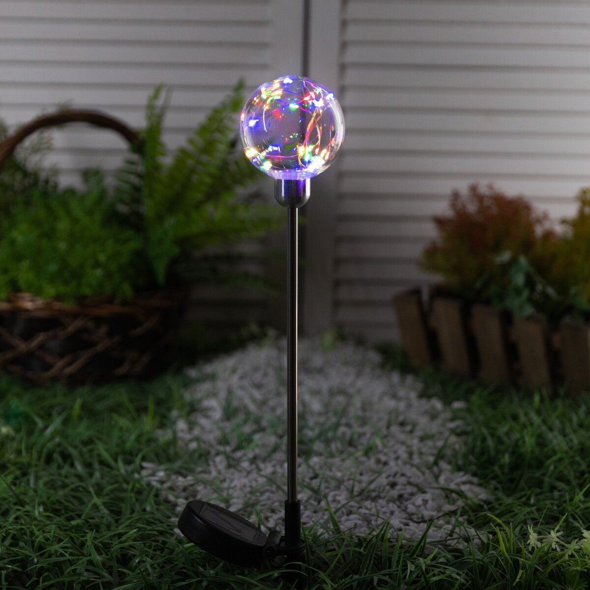 Каждый мечтает, чтобы на его садовом участке был идеальный порядок. И, конечно, всегда хочется добавить туда немного красоты. Выбрать светильники — разумное решение, ведь они не только украсят сад, но и будут освещать его в тёмное время суток. В статье мы собрали самые интересные модели. Сразу хочется заметить, что все светильники, представленные в подборке, работают от солнечной батарее. Это очень удобно и существенно экономит ваши деньги. Большинство моделей достаточно просто воткнуть в землю и распределить вокруг грядки, клумбы или вдоль дорожки, однако есть и подвесные светильники, на случай если у вас натянуты верёвки на территории. Фото 1. Садовый светильник «Шар»