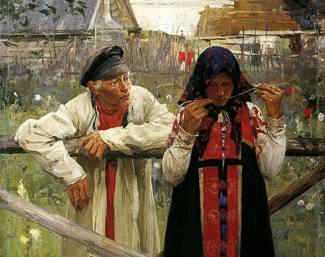 У деревянной изгороди неподвижно стоят парень и девушка: он в напряжённом ожидании, она в глубоком раздумье. На картине Михаила Иванова «Ответа жду», написанной в 1900-м году, запечатлена сценка из жизни поморов, вольнолюбивых и мужественных хозяев Русского Севера. По заведённой традиции юные потомки новгородцев сами искали себе невесту. Молодёжь сообща трудилась и вместе проводила вечёрки, а заодно присматривалась друг к другу. Если пара достигала взаимопонимания, то родители засылали сватов. На полотне наступил самый волнующий миг зарождающихся отношений: парнишка только что признался возлюбленной в своих чувствах. Следующее слово за избранницей, но она не спешит с ответом. Так же, как многие поколения женщин до неё, молодая поморка обстоятельно обдумывает предложение. Загорелое девичье лицо целомудренно опущено долу. Крупные, огрубевшие от работы руки медленно теребят травинку. Молчание тянется давно. Терпеливый юноша не торопит с решением, но в то же время его поза г