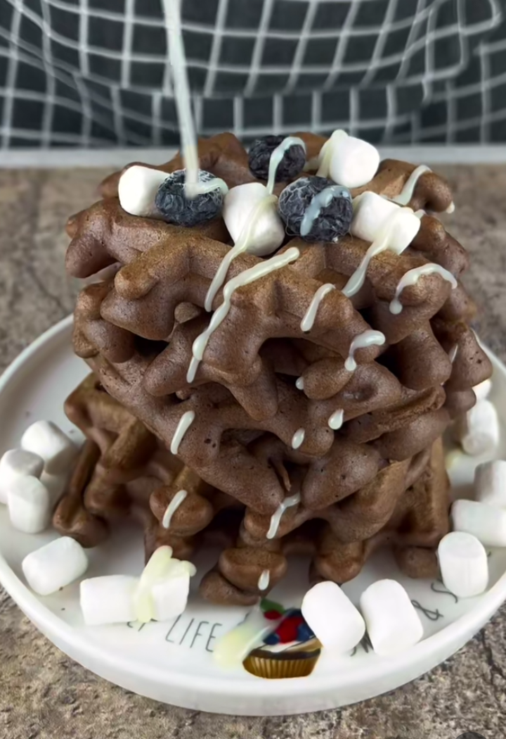 Ингредиенты: Яйца - 3 шт. Сахар - 2-3 ст. л. Мука - 100 г. Разрыхлитель - 1ч.л. Какао - 2 ст.л. Сливочное масло - 50г. Приготовление: Яйца взбиваем венчиком вместе с сахаром и растопленным маслом. Добавляем муку, какао и разрыхлитель. Замешиваем тесто. Если тесто получилось не текучим добавьте 3 ст.л. молока. Вафельницу смазываем маслом и выпекаем вафли около четырёх минут. Подача#1: Кладём вафли друг на друга и посыпаем маршмеллоу по желанию добавляем фруктов, ягод. Поливаем сгущёнкой и готово! Подача#2. Кладём вафли кругом с нахлёстом друг на друга как бы образуя пончик и по желанию добавляем фруктов, ягод. В получившуюся выемку наливаем сгущёнку и готово! Всем приятного аппетита!