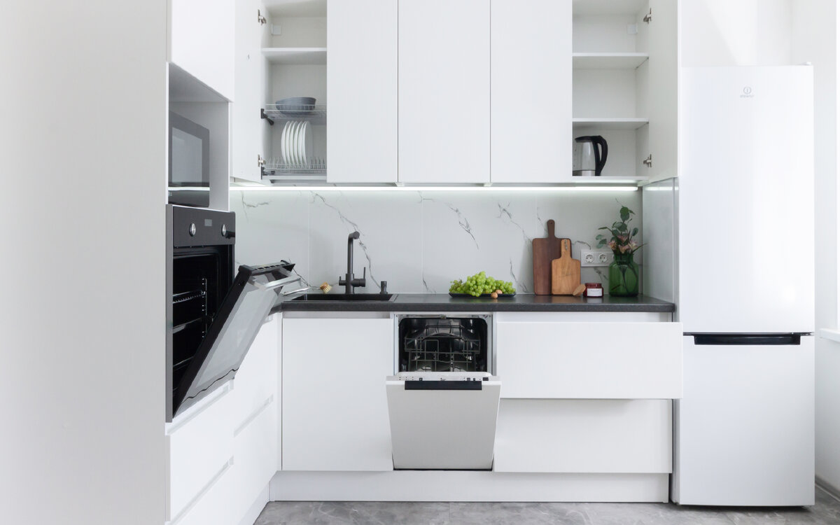 Самый частый запрос от наших заказчиков — подобрать гарнитур для небольшого помещения, чтобы кухня казалась светлой и просторной. И самое простое решение в данном случае оказывается и самым верным: выбрать светлый тон для всего — стен, пола, потолка и кухонного гарнитура. Так кухня действительно станет максимально светлой и просторной.