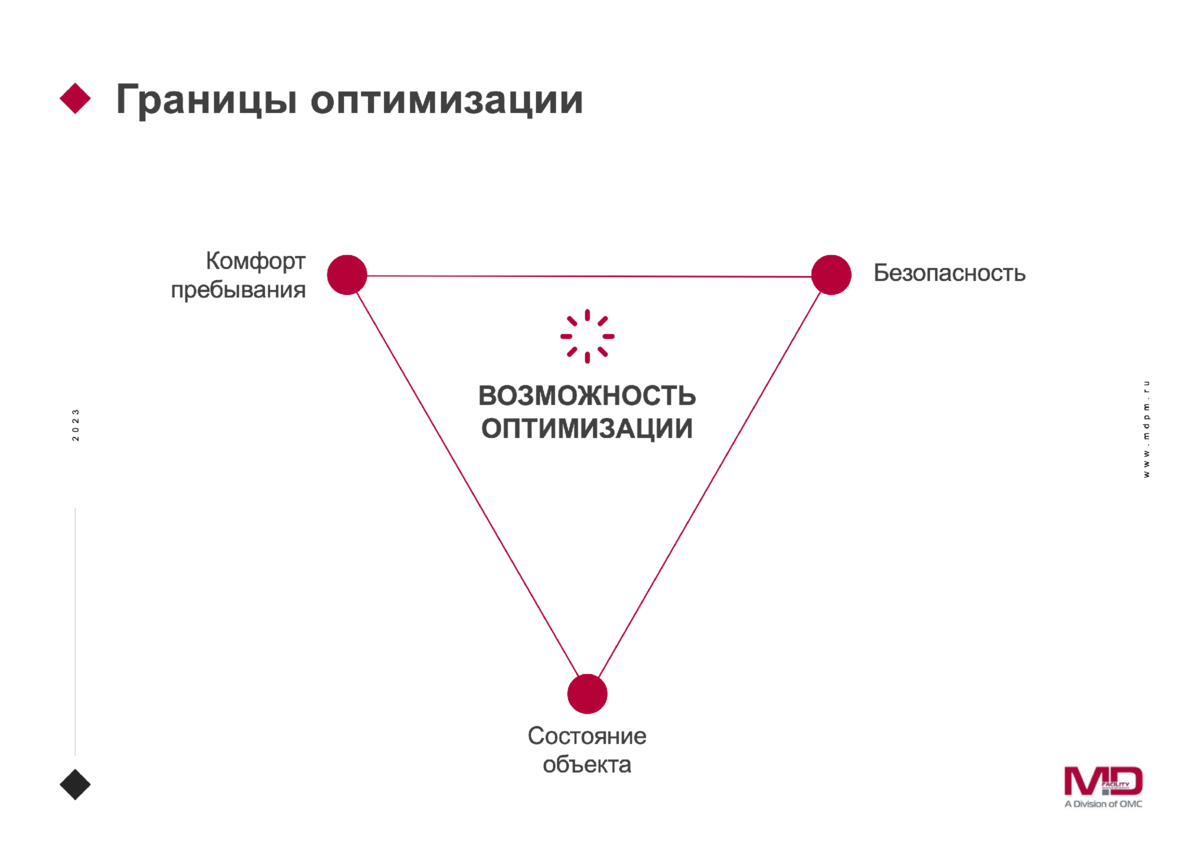 Специалисты MD Facility Management разработали несколько способов нелинейной оптимизации расходов на эксплуатацию торговых, офисных и других зданий коммерческой недвижимости. Использование данных подходов позволяет частично нивелировать рост цен на FM-услуги. Турбулентность в экономике России, ставшая одной из главных причин ухода арендаторов или сокращения ими занимаемых площадей в зданиях собственников, заставила владельцев недвижимости экономить на FM-услугах. На сегодняшний день многие из них уже исчерпали все возможности по снижению расходов на техническую эксплуатацию зданий без риска для нормального существования объекта. И если баланс будет нарушен, это может привести к началу безвозвратных процессов: обветшанию зданий, частым сбоям в работе инженерных систем и оборудования, что в конечном итоге скажется на комфорте арендаторов, на безопасности их нахождения в зданиях, в том числе и противопожарной. В настоящее время общий объем площадей, обслуживаемый FM-компаниями, превысил