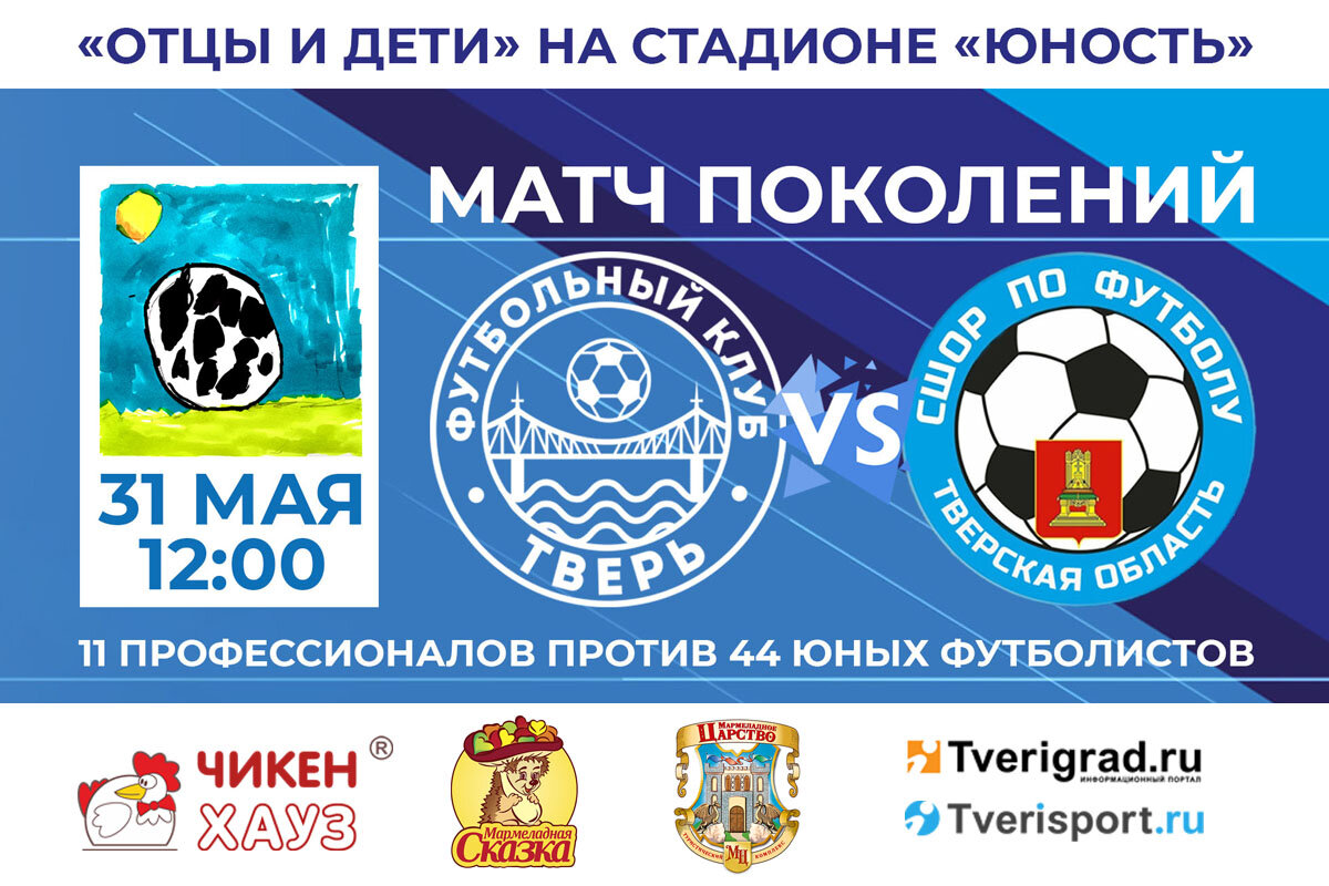 Накануне Международного дня защиты детей, 31 мая, на стадионе «Юность» состоится уникальный товарищеский матч «Отцы и дети», в котором основной состав ФК «Тверь» сыграет против воспитанников областной СШОР по футболу. На поле одновременно будут находиться 55 игроков: 11 профессионалов и 44 юных футболиста.