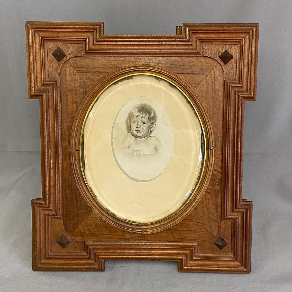 Что хорошо, оригинальное овальное стекло с фасетным краем сохранилось, да и вообще, она в очень хорошей сохранности, без утрат и с подставкой, которая обычно отдирается или ломается.