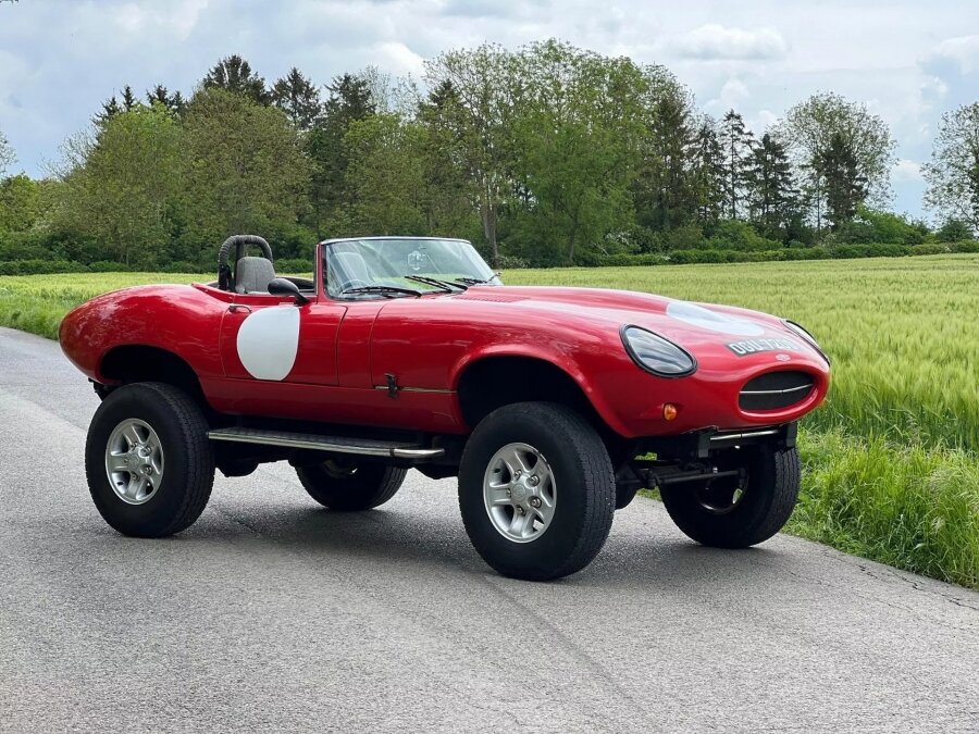 Jaguar E-Type считается одним из самых красивых классических автомобилей своей эпохи, особенно в варианте с открытым кузовом, поэтому ни один владелец никогда не решился бы превратить его в нечто похожее на то, что вы видите на фотографиях. К счастью, E-Type 4×4 «Monster» сделан не из оригинального E-Type. Это лишь копия, созданная на базе Range Rover. На первый взгляд внедорожный E-Type можно принять за рендеринг, но перед нами 100% реальные фотографии. Автомобиль находится в полностью рабочем состоянии и разрешен для использования на дорогах Великобритании. Огромный дорожный просвет, шины с высоким профилем и легкосплавные диски с пятью спицами от Land Rover Defender делают кабриолет похожим на монстр-трак. Кузов автомобиля взят от реплики JPR Wildcat E-Type. Внешний вид находится в очень хорошем состоянии. В комплекте идёт убирающийся мягкий верх, дополнительный багажник сзади и металлические пороги, облегчающие посадку и высадку. Салон выглядит довольно просто с двумя сиденьями с т