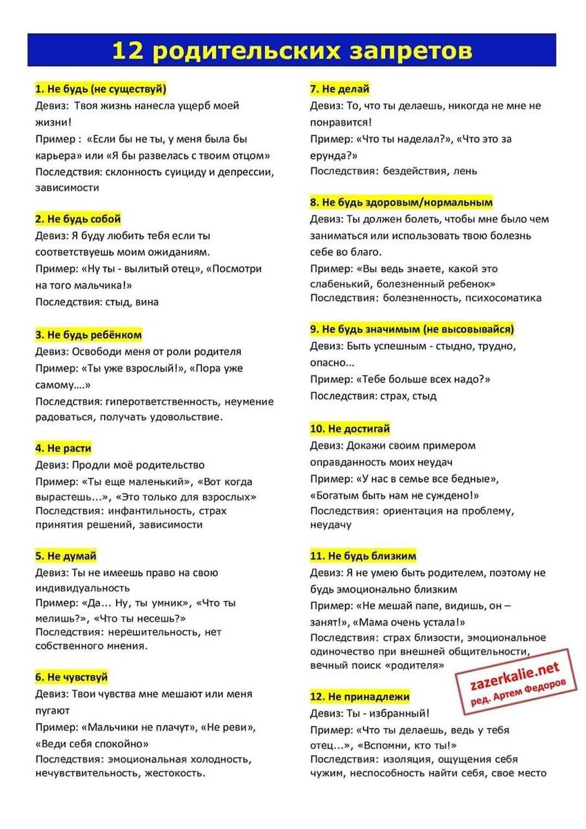🔘Примеры фраз: «Если бы не ты, у меня была бы карьера», «Если бы не ты, я бы развелась с твоим отцом». Последствия: склонность к суициду и депрессии, зависимости.
