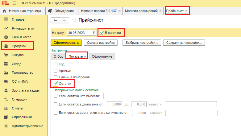 Долгожданная возможность в 1С Бухгалтерия 3.0 : формирование прайс листа с остатками по складам. Меню главное- Продажи- Прайс-лист.. Установите флаг "В Наличии" если вам необходимо указать только товары на остатках. В разделе настройки вы сможете выбрать показатели, нпример Остаток и в форме отчета будет видно количество остатка. Так же здесь можно выбрать фильтры для отбора по складам и т.д. Вы всегда можете заказать услуги по 1с, а также приобрести, обновить программы 1С с помощью наших специалистов, написав нам на e-mail: info@topyc360.ru или в Телеграм https://t.me/uslugi1ctopyc