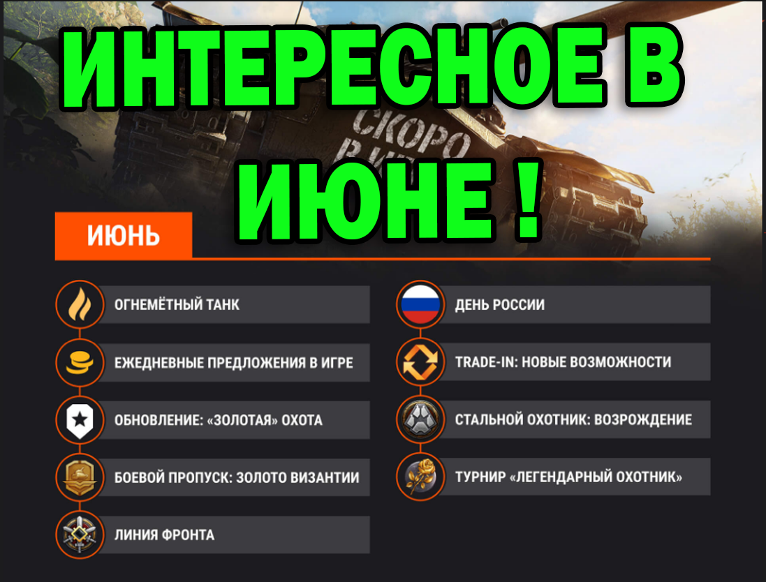 Огнемётный танк. До 7 июня 3:00 нужно успеть выполнить марафон и докупить 4 хернюшки, чтобы получить танк. Поторопитесь! Далее уже выходит обнова и всё, габелла вашему Горынычу будет) Ежедневные предложения. Во вкладке «Лучшее» внутриигрового магазина будут появляться предложения за кредиты, боны или золото. Один день — одно предложение. И так весь июнь. А вот тут очень интересно. Конечно, вряд ли нам будут за золото или серебро раздавать Чифа, но думаю. будут какие-нибудь интересные штуки. Типа всякие стили, может быть дохлые прем. танки за серебро или боны. Ну посмотрим, интересно будет понаблюдать. Обновление «Золотая охота». Выход обновления запланирован на 7-е июня. В игре появятся «золотой» Боевой пропуск, большой турнир в Стальном охотнике и многое другое. Тут я так понимаю - добавят 4 главу боевого пропуска с каким-нибудь интересным премиумным танком. Скоро узнаем, осталась всего 1 неделя! Боевой пропуск: «Золото Византии». В новом сезоне ты сможешь получить до 2 500 золота: