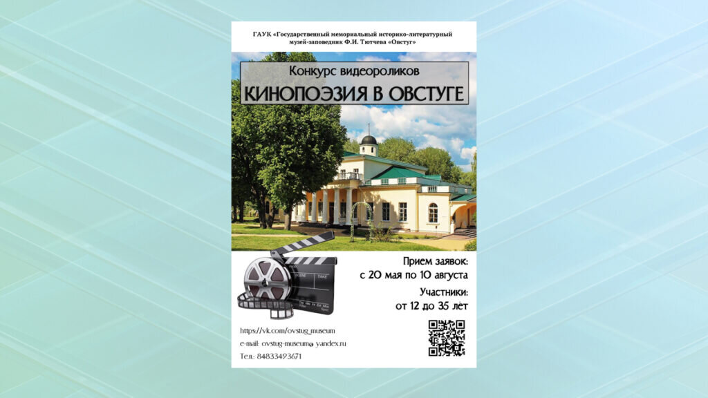 Музей-заповедник Ф.И.Тютчева «Овстуг» совместно с Ассоциацией кино и медиа педагогов «Институт визуальных коммуникаций объявляет о начале приема заявок на творческий конкурс видеороликов «Кинопоэзия в Овстуге». Принять участие в конкурсе могут молодые люди от 12 до 35 лет. В течение летнего периода на территории усадьбы участники конкурса могут снять свой фильм/видеоролик, в основе которого лежит стихотворение Ф.И. Тютчева. Лучшие работы будут опубликованы на официальной странице музея-заповедника. Ознакомиться с Положением конкурса и узнать условия его проведения можно на официальном сайте музея в сети Интернет musovstug.ru в разделе «Афиша», в группе музея в социальной сети «ВКонтакте», по телефону 8(48334)93671 или по электронной почте. Заявки на участие в конкурсе принимаются до 10 августа 2023 года по электронному адресу с темой письма «Кинопоэзия». Подведение итогов конкурса и церемония награждения его победителей пройдут в музее-заповеднике Ф.И. Тютчева 28 августа 2023 года. 0+