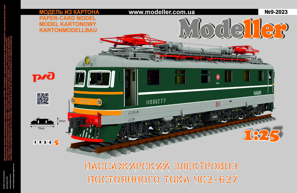 В этом материале познакомлю Вас с необычной моделью. Во-первых, это не особо распространенный для железнодорожного моделизма крупный масштаб 1:25, во-вторых модель из бумаги или скорее картона. Речь идет о модели электровоза ЧС2-627. Прототип модели работал с 1966 по 2012 год в депо Самара (Куйбышев). Модель издана компанией Modeller. Модель предлагается в виде каталога формата А3. В каталог входят листы с инструкцией, листы с деталями для наклеивания на картон соответствующей толщины, листы с деталями на плотной бумаге. Автором данной модели является Евгений Кистанов. Обложка каталога-набора для сборки выглядит следующим образом. А теперь предлагаю посмотреть фотографии, собранной из данного набора, модели. Внутреннее оборудование и интерьер, смотрится весьма достойно. Полагаю, для бумажной модели смотрится достойно и на высшем уровне, да и не только бумажной. Это не единственная модель компании Modeller. В масштабе 1:25 также выпускаются наборы для сборки локомотивов и вагонов совет