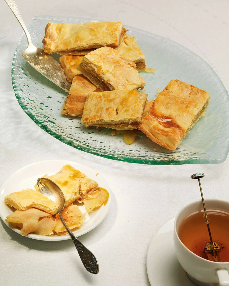 2. Один пласт теста тонко раскатать и уложить на смазанный маслом противень. На него щедро выложить мелко нарезанные яблоки. Посыпать смесью корицы с сахаром. Тонко раскатать второй пласт теста и положить сверху. Обрезать края, смазать белком, проткнуть вилкой и отправить в духовку.