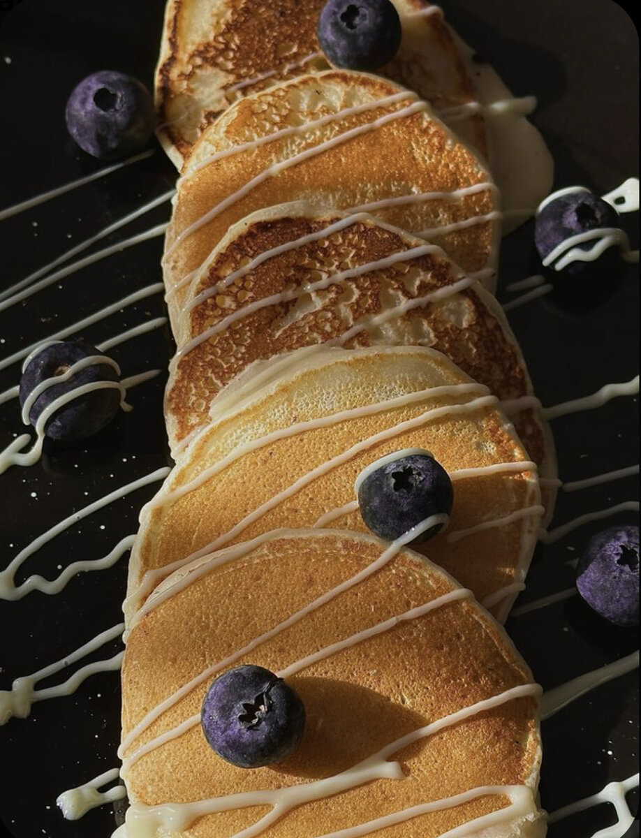 Продукты (на 4 порции) Яйца - 2 шт. Молоко - 200 мл Мука пшеничная - 10 ст. л. Разрыхлитель - 1 ч. л. Сахар - 2 ст. л. Ванильный сахар (по желанию) - по вкусу Пошаговый рецепт: Складывайте готовые панкейки башенкой на тарелку. Можно украсить ягодами клубники, голубики. Полить сверху сгущёнкой, мёдом или шоколадной пастой. Приятного аппетита!
