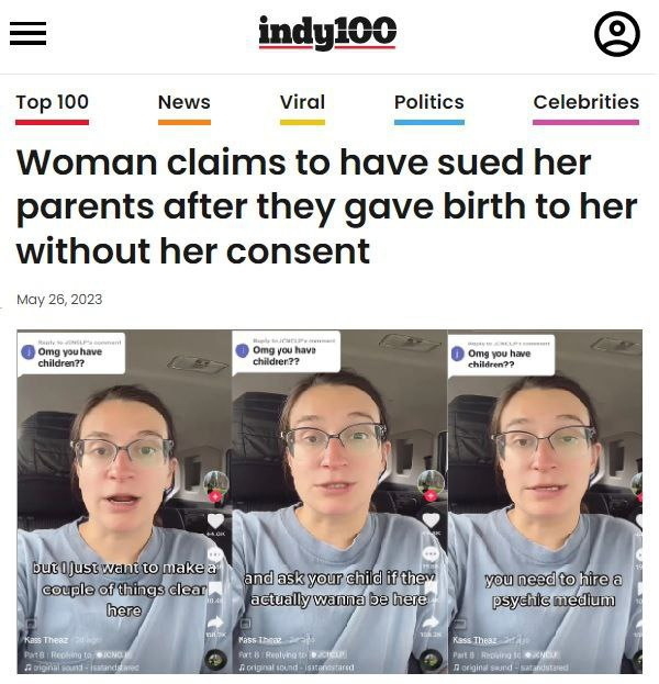 Женщина подала в суд на родителей за то, что те родили ее без ее согласия.