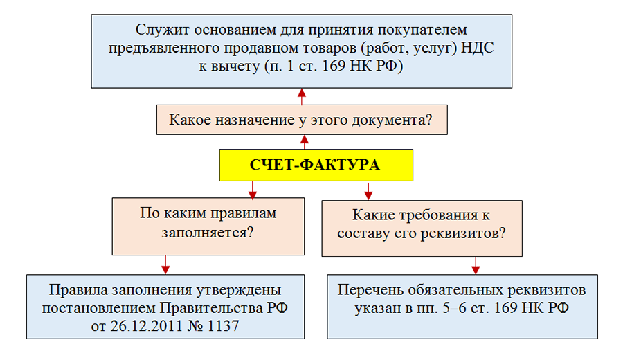 К самому счету-фактуре налоговое законодательство предъявляет серьезные требования. На рисунке ниже отражена основная информация о назначении счета-фактуры и нормативных документах, устанавливающих порядок его оформления: